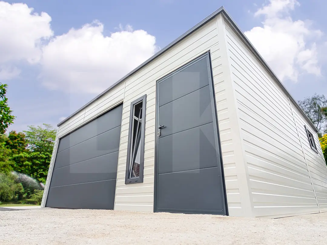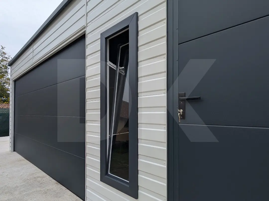 Mobilgarázs hátra lejtős tető 6.0m x 5.8m tiszta fehér, antacitszürke színű szekcionált kapuval. Ez a garázs a modern dizájn és a funkcionalitás tökéletes ötvözete. A szerkezetben vízszintes T-7 lemezbordázat kapott helyet, amely minimalista, ugyanakkor elegáns megjelenést biztosít.